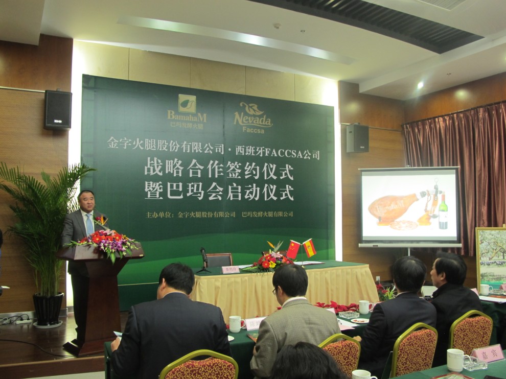 西班牙FACCSA公司負責人拉蒙先生在致辭中表示,發(fā)酵火腿在中國有巨大的市場空間,巴瑪火腿是中國發(fā)酵火腿的領軍品牌。雙方建立戰(zhàn)略合作關系,是企業(yè)發(fā)展需要,也是優(yōu)勢互補的最佳選擇。今后,雙方要整合資源,加強交流,深化合作,努力把兩個企業(yè)的合作打造成中西兩國經(jīng)貿(mào)合作的典范。