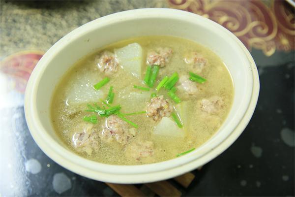 制作方法:夾心肉洗凈、剁碎,火腿切丁,生姜切末,備用;將上述材料混合,加入適量鹽、糖和料酒,再加入一個(gè)蛋清,用手混合均勻,再反復(fù)摔打至少10分鐘,至肉有彈性,再捏成大小適宜的小球,備用;豬大骨熬湯,備用;冬瓜洗干凈、切片,起油鍋略炒,加入大骨湯,燒開(kāi)后逐一放入肉丸,再根據(jù)個(gè)人口味加入鹽等調(diào)味料,待肉丸燒熟即可起鍋。
